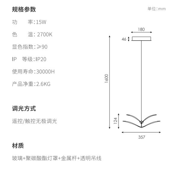 如翼吊灯用双层弯曲的造型作为主要造型特征形成在空间里自由灵动的造型,,以一定的角度倾斜,,,,形成丰富的画面,,两翼的线条均为精心设计,,精准控制光线的传播,,将直下光和漫反射光结合,,,70%灯光向下,,,30%灯光向上,,在空间里形成舒适的光学效果,,,下灯罩为片状玻璃印刷专门调制的乳白色油墨,,,,热弯成对应弧度,,,,灯光透过灯罩呈现出更加柔和的视觉效果;边缘特意留有5mm宽度透明环,,使视觉更精致轻巧;灯罩利用两个金属“领夹”式的杆连接固定,,整体视觉优雅;