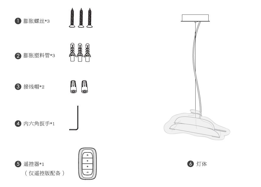 膨胀螺丝*3;膨胀塑料管*3;内六角扳手*4;接线帽*2 遥控器*1(遥控版本);灯体*1;