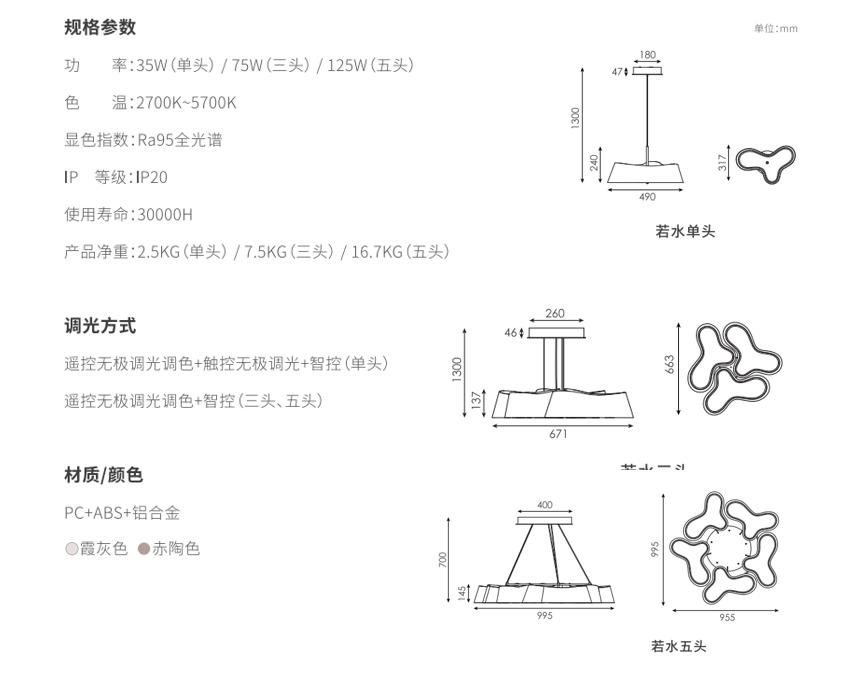 若水吊灯源于中国古典意境中的山水,,,外形如山的曲线婀娜蜿蜒,,,其内侧光晕水波纹,,,,缓缓晕开;巧妙地将曼妙光影融于山水意境,,,,如空间中悬浮的自然景观,,专门设计调试的水波纹棱面扩散罩可以起到一定的视觉防眩作用,,,把原本进入到人眼的杂散光折射掉,,,,同时可以提升产品的精致品质感;空间光的强功能性和强装饰性通常是个矛盾点,,但是若水则取得了一个平衡,,,保证较强光学输出的同时可以有其装饰表现